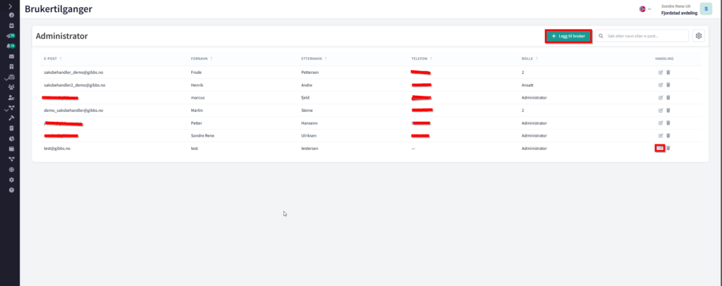 - «Rediger rolle» Etter du har lagt til en ny bruker/eksisterende bruker i brukergruppen, så kan du velge hvilke rolle du skal tildele til brukeren. Administrator, ansatte, saksbehandler eller kunde.
